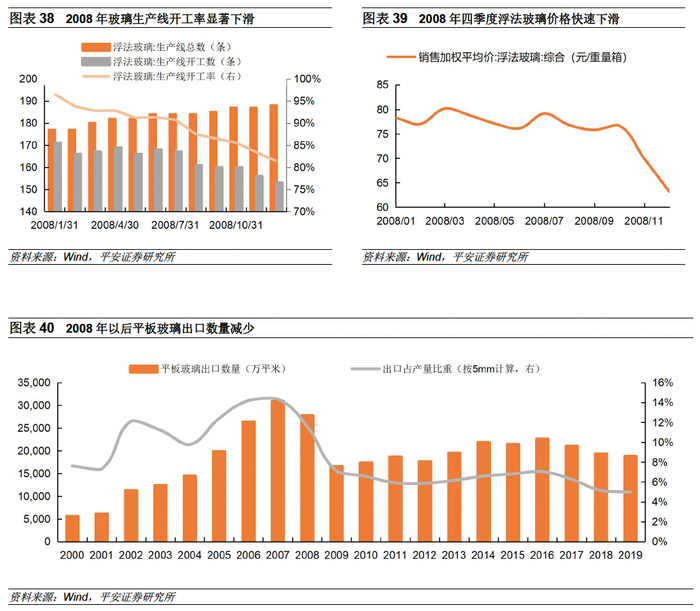 随着2008 年金融危机袭来,玻璃行业受到明显冲击。受金融危机影响,2008 年下半年房地产单月投资增速显著回落,全年商品房销售面积、销售额分别同比下滑14.7%、16.1%,资金端压力也促使房企暂缓竣工,全年竣工面积同比下滑3.5%,增速较上年下滑7.8PCT。国内下游需求放缓亦对玻璃行业形成冲击,叠加外围经济不振、人民币升值以及平板玻璃出口退税率下降(2007 年7 月1 日起出口退税率由11%降至5%),影响平板玻璃出口,2008 年我国平板玻璃产量仅同比增长6.5%,增速较上年下滑6.9pct,生产线开工率显著降低,四季度玻璃价格快速下滑,行业利润率亦持续承压,如南玻A 单季度毛利率从2008 年一季度32.5%降至四季度25.3%,全年归母净利润同比下滑2.6%。