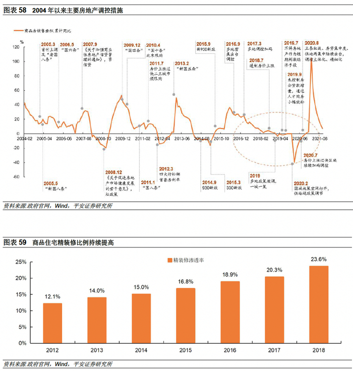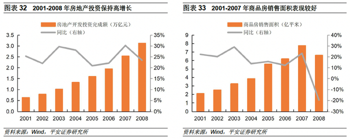 -房地产政策转向刺激:1)信贷方面,2008 年10 月房贷利率下限降至基准利率0.7 倍,最低首付款比例下调至20%,地产项目最低资本金此后也下调至20%。2)税收方面,2008 年10 月财政部提出首次购买90 平米以下普通住房的,契税税率下调至1%,对个人销售或购买住房暂免征收印花税,对个人销售住房暂免征收土地增值税。3)住房保障方面,2008 年11 月国务院常务会议提出“四万亿”投资计划,包括加快建设保障性安居工程,总投资约4000 亿元。