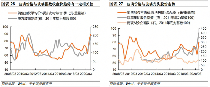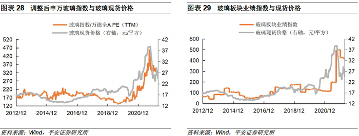 拆分玻璃指数可知,玻璃价格与业绩表现高度相关,近年板块估值波动弱化。为剔除市场情绪波动对玻璃板块股价表现影响,我们将申万玻璃制造指数除以万德全A 的PE(TTM)得到调整后玻璃指数,因Wind 披露的浮法玻璃销售加权平均价只更新至2020 年底且为月频数据、玻璃现货价格为日频数据、自2012 年12 月3 日期更新,我们将调整后玻璃指数与玻璃现货价格拟合如下图,可见两者自2019H2 以来相关性很高,但2012-2019H1 相关性一般。我们进一步将该指数拆分为业绩指数(申万玻璃制造指数/申万玻璃制造指数PE(TTM))与板块相对估值指数(申万玻璃制造指数PE(TTM)/万德全A 指数PE(TTM)),可见玻璃板块业绩指数与现货价格走势高度一致、略微滞后于现货价格,印证玻璃价格对企业业绩端的重要影响,而2012-2016 年玻璃板块相对估值指数波动较大,反映市场对玻璃这种周期行业风险偏好存在变动,2017 年以来随着