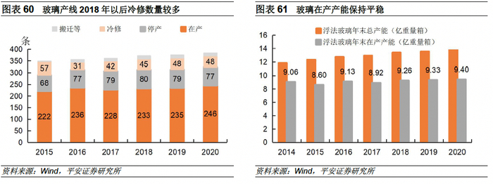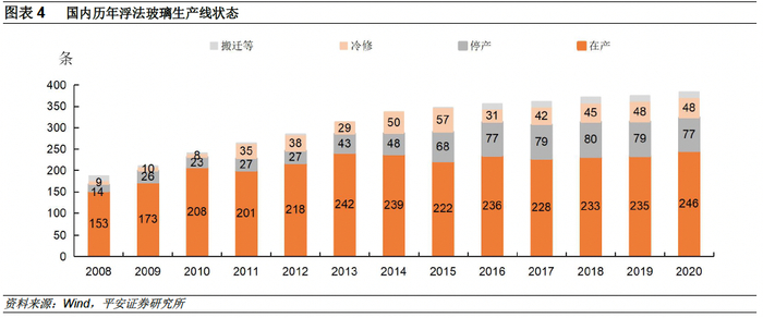 窑炉陆续冷修停产,叠加房地产进入存量市场,2013年以来玻璃在产产能趋于平稳,与总产能差距扩大。2008年以前,国内浮法玻璃总产能与在产产能基本保持同步,一方面因国内玻璃产能大多于2001年以后投产,按照8-10年窑龄计算,冷修需求不大;另一方面因房地产市场蓬勃发展、下游需求旺盛,玻璃行业景气度高,停产冷修对厂商来说代价巨大。2008年以后浮法玻璃在产产能与总产能出现背离,主要因:1)随着房地产逐步进入存量房市场,玻璃需求亦有所放缓,需要的实际产能规模趋于平稳;2)行业冷修需求逐步来临,尤其是当产能过剩问题日益严重,例如2009、2010年在四万亿政策和房地产新一轮周期带动下,玻璃产能需求持续增加,随着供求矛盾逆转、玻璃行业进入低谷,玻璃企业选择提前冷修;3)政策要求淘汰落后产能,例如《建材工业“十二五发展规划》中提出“十二五”期间淘汰落后平板玻璃产能5000万重量箱目标,2011-2015年停产生产线从21条升至68条,到2020年末进一步升至77条。2013年以来,浮法玻璃生产线开工数、在产产能在较小区间范围波动。