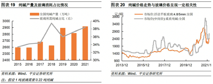 纯碱需求以玻璃为主,价格波动与玻璃价格呈现一定相关性。纯碱即碳酸钠,上游原材料为盐与氨气,下游需求来自玻璃、无机盐、氧化铝、洗涤用品等行业,其中玻璃消耗纯碱占比最大、接近四成,因此玻璃需求对纯碱量价影响最大,纯碱价格走势亦与玻璃价格呈现一定相关性,且滞后于后者。