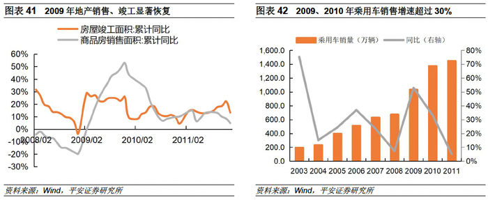 - 地产销售、竣工显著恢复:受益政策大幅刺激,叠加城镇化快速推进、住房需求尚未见顶,全国销售面积单月同比增速自2009 年3 月转正(+16.4%),11 月达到99.6%的高点,2009、2010 年全国商品房销售面积分别同比增43.60%、