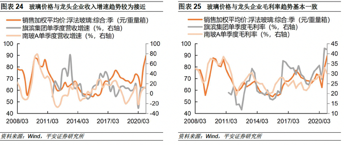 尽管成本端存在波动,但玻璃利润以价格为主导。因玻璃为纯碱重要需求来源,纯碱价格与玻璃价格走势相近,同时为应对燃料价格波动,玻璃生产企业通常为生产线配备两套或更多的燃烧系统,或是向下游转移成本,因此尽管成本端存在波动,尤其是油价波动导致石油焦、重油价格调整,但玻璃企业仍能一定程度上缓解成本端压力,玻璃利润率与价格走势基本一致;同时玻璃价格涨跌亦促使企业调整产能供给,通过量的维度影响企业收入业绩。从历史数据看,玻璃价格与旗滨、南玻等主流玻璃企业营收、毛利率趋势基本一致。