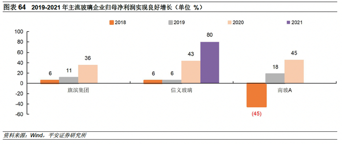 需求端,竣工高峰逐步来临,玻璃需求陆续释放。尽管销售至竣工周期拉长,但随着2016 年以来销售进入交房阶段,2019年下半年开始竣工需求逐步释放,2019 全国竣工面积同比增长2.60%,2020 新冠疫情影响地产施工进度,竣工面积略有回落(同比降4.90%),但随着疫情得到控制,2021 年前八月竣工面积同比增长26%。玻璃需求旺盛支撑下,玻璃价格持续上涨,尤其是2020 下半年开始玻璃价格大幅攀升,屡创历史新高,带动玻璃行业利润水平大幅改善。