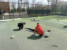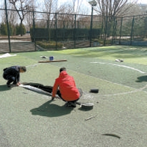 经过现场讨论,各部门很快达成解决方案。施工人员对坑洼处深度进行测量,破开草皮填平坑洼并使用胶粘修复草皮。经过一下午的修整,足球场所有坑洼处均被填平,两天后,球场粘胶风干完毕恢复正常使用。不仅如此,现场查看过程中,体育局工作人员发现原有球门网已经出现严重破损,于是立即为球场更换了两个全新的球门网。