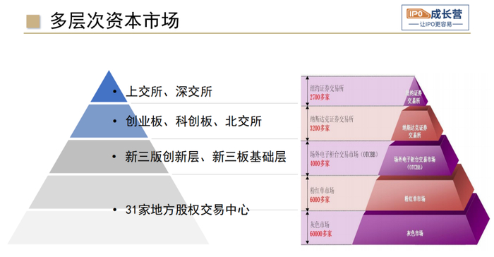 中国目前已形成以沪深交易所主板、深交所创业板、上交所科创板和新设立的北交所精选层为核心的场内市场,以及全国股份转让系统(俗称“新三板”)和地方股权交易中心等区域性股权市场组成的场外市场。场内和场外市场共同组成了我国多层次的资本市场体系。