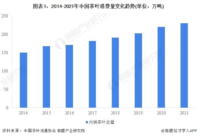 2014年以来,我国茶叶消费呈现持续增长的发展态势,据统计,2021年,全国茶叶消费量为230.19万吨,较2014年的150.25万吨增长近80万吨。