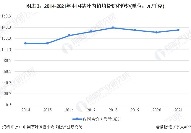 茶叶销售总额持续提升的原因一方面是消费者需求的持续提升,另一方面则是茶叶价格的持续走高,2014年以来,茶叶销售均价总体呈现震荡上行的发展态势,到2021年,我国茶叶销售均价135.5元/千克,价格仅次于2018年的139.3元/千克。
