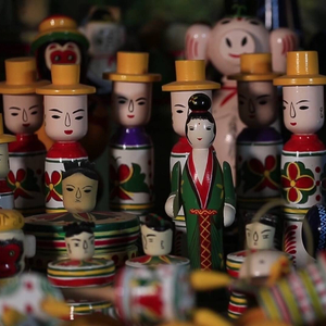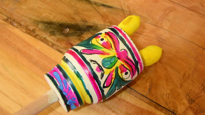 在传统的木旋玩具中,虎头槌是其中的典型代表。一个圆柱形的主体,链接一个手拿棒,上面还有两个木制的耳朵,玩具本上有红、黄、绿三种主色,这也是传统木旋玩具的三大主色,鲜亮的颜色让人眼前一亮,夸张的绘画手法描绘出老虎头的轮廓。最具特色的是虎头槌两个木制耳朵可以灵活摆动,在粗糙的做工中又显精巧。虎身内的木头掏空,里面装入沙粒,左右摇晃又能发出沙沙的响声。