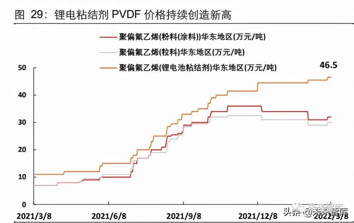 不同型号 PVDF 产品涨价出现分化,锂电粘结剂 PVDF 产品价格持续创造新高。2021 年,由于地产竣工维持高位和新能源电动车需求放量,全线 PVDF 及 R142b 价格持续 上涨,行业景气高行。根据百川盈孚统计, 2022 年 3 月 8 日,华东地区锂电池粘结剂 PVDF 产品价格为 46.5 万元/吨,锂电粘结剂 PVDF 价格连续上涨,当前缺货现象仍然 严重;粉料、粒料级 PVDF 产品价格分别为 32 万元/吨、30 万元/吨,由于常规级 PVDF 在涂料、光伏背板等领域下游替代品较多,产品价格上涨导致市场占比不断压缩,价格 较 2021 年 11 月最高点(粉料级 36 万元/吨,粒料级 32.5 万元/吨)有所下滑。同时, 原料 R142b 价格同样大幅上涨,2022 年 3 月 8 日主流价格达到 19.5 万元/吨,PVDF 生产厂家自给原料成为盈利关键。(报告来源:未来智库)