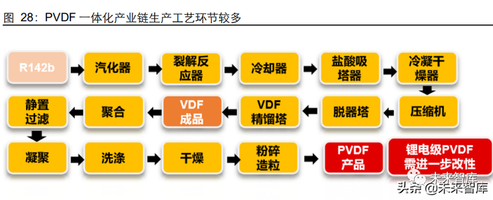 PVDF 生产工艺复杂,装置建设周期较长。仅从 R142b 制备 PVDF 就须经历十余步骤, 过程冗长,装置较多,生产建设繁复,装置投资规模高。锂电粘结剂 PVDF 装置要求更 高,且需额外改性调试、后期加工、并通过下游验证,达到使用条件耗时常高于预期。东岳集团(2019 年 4 月二期项目环评)、巨化股份(2014 年 12 月项目环评)、昊华科 技(2016 年 7 月项目环评)的粘结剂 PVDF 项目实际达产时间均较预期延后。