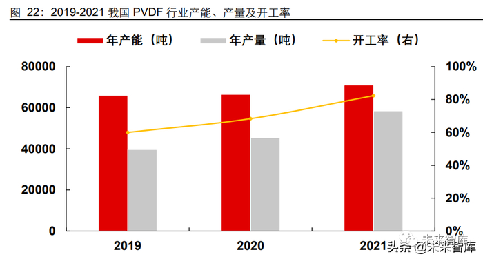 由于技术壁垒高,少数 PVDF 能够量产通过电池厂商验证的锂电粘结剂 PVDF 产品, 2021 年我国锂电粘结剂 PVDF 年产能预计仅 1.9 万吨/年。