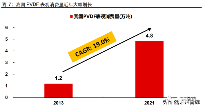 PVDF 在 1961 年由美国 Pennwalt 公司首先实现商品化,20 世纪 90 年代后在我国首 先应用于涂料领域。进入 21 世纪,我国基建、工业、科技飞速发展,PVDF 在建筑、 化工防腐、电气电子、水处理、新能源等领域应用范围持续拓宽,市场规模逐渐扩大。2013-2021 年我国 PVDF 表观消费量从 1.2 万吨增长至 4.8 万吨,年复合增长率高达 19.0%。