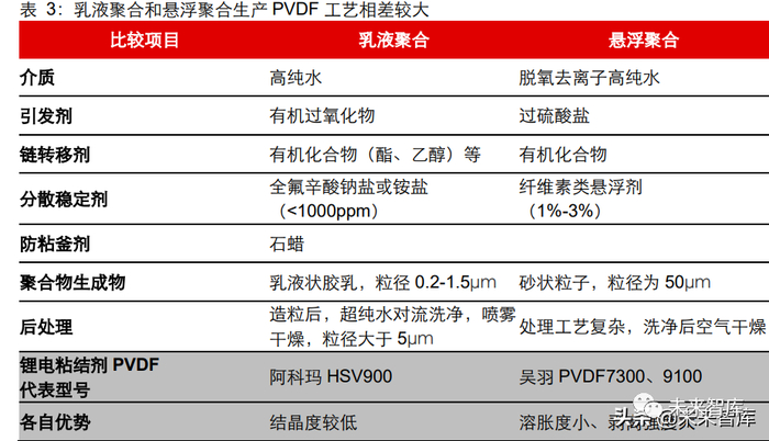 针对锂电粘结剂 PVDF 性能要求,生产厂商提供的产品解决方案不同。聚合方式对于 PVDF 的性能具有重要影响,两种聚合方式的介质、引发剂、链转移剂、分散稳定剂以 及后处理方法均不同,工艺相差很大,性能各有多长。阿科玛采取乳液聚合工艺,产品 HSV900 具备较低的结晶度,吴羽采用悬浮聚合工艺,代表产品 PVDF7300 溶胀度较 小、剥离强度较大。
