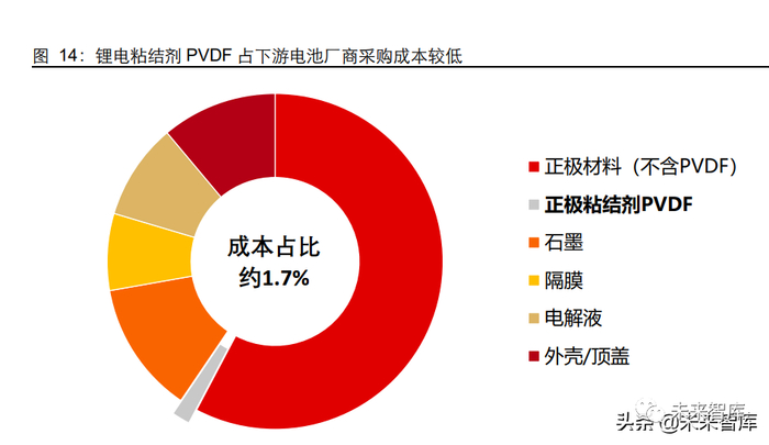 锂电粘结剂 PVDF 占下游成本低,有提价潜力。以宁德时代 2020 年 3.48 亿/GWh 的原 料采购成本测算,PVDF 仅占其采购成本的约 1.7%(按照 PVDF 添加量 50 吨/GWh, 2020 年锂电用 PVDF 价格 11 万元/吨测算)。2021 年来,尽管 PVDF 价格飙升,但在 锂电材料整体价格大涨的背景下,其成本占比也仅上升至约 5%。假设其他材料价格保 持不变,未来锂电正极粘结剂级 PVDF 每涨价 10 万元/吨,成本占比提升仅约 1%,其 价格上涨对下游电池厂成本端影响较小,仍具备潜在提价潜力。(报告来源:未来智库)