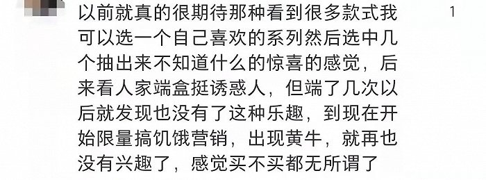但是不可否认的是,消费者入坑,是因为兴趣爱好,以及打开盲盒一刹那的惊喜和乐趣,然后当盲盒开始玩起限量饥饿营销、以及出现黄牛炒作价格后,反而乐趣就没了。