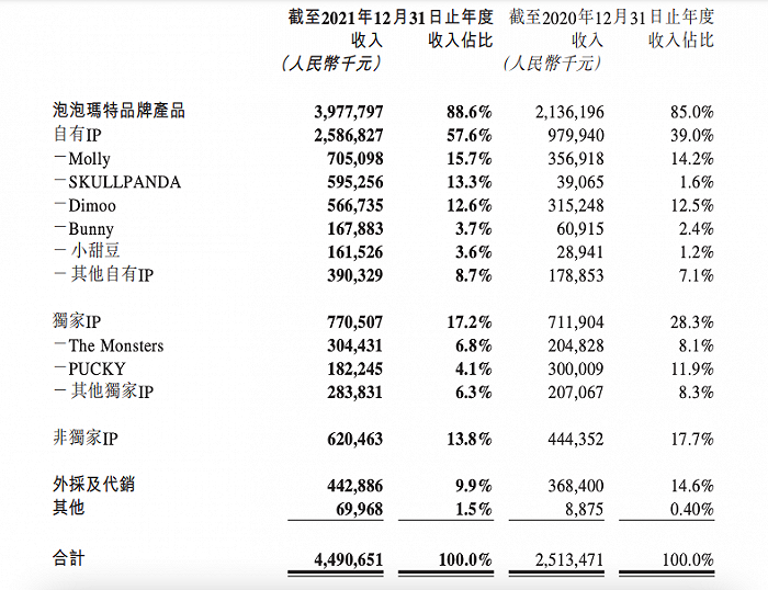 从财报来看,自有IP“Molly”依然是收入占比最多的王牌,实现收入7.05亿元,同比增长97.6%;Dimoo和SKULLPANDA在2021年分别实现收入5.67亿元和5.95亿元,同比分别增长了79.8%和1423.8%。