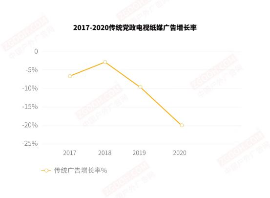 而党政媒体面临互联网的崛起,没有找到合适的应对方法,自2019年开始断崖式下降。互联网广告已经饱和,增长率持续走低。户外广告成为增长率最快的广告类型。