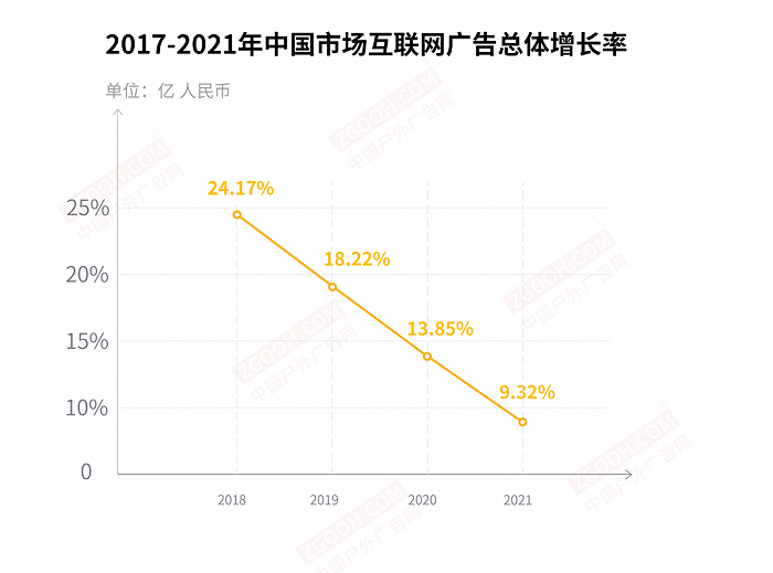 互联网广告从17年开始总体收入增长率持续走低,到2021年增长率不足10%,低于户外广告的增长率。