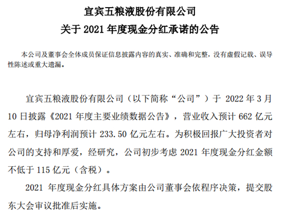 3月29日,五粮液在收盘后发布公告称,2021年度拟不低于115亿元用于分红。五粮液2022年3月10日披露《2021年度主要业绩数据公告》显示,2021年营业收入预计662亿元左右,归母净利润预计233.50亿元左右。