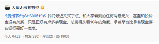 3月29日,知名投资人段永平在股票交流平台表示,“最近又买了点茅台。”但他解释买的原因是,“和大家看到的任何消息无关,甚至和股价也没有关系,只是正好有点多余现金。总觉得从看10年的角度,拿着茅台比拿着现金存在银行要好一点点。”
