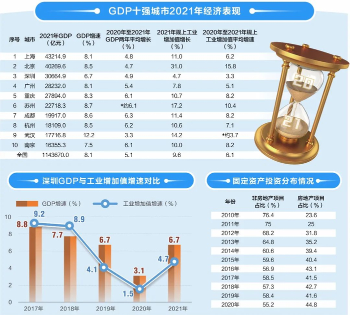 另外,2021年全年,深圳规模以上工业增加值比上年增长4.7%,这一表现同样在国内GDP十强城市中垫底;两年平均增长3.3%,不及受疫情影响严重的武汉。