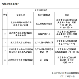 据北京市房山区市场监督管理局微信号消息,北京市房山区市场监督管理局3月29日通报,检查中发现部分5家“五类之外”市场主体存在疫情防控措施落实不到位的问题,主要包括:未建立员工体温记录台账(未及时记录)、未建立场所消杀记录台账(未及时记录)、员工未佩戴口罩、场所内无一米线、未对消费者体温检测、未查验消费者健康宝等问题。
