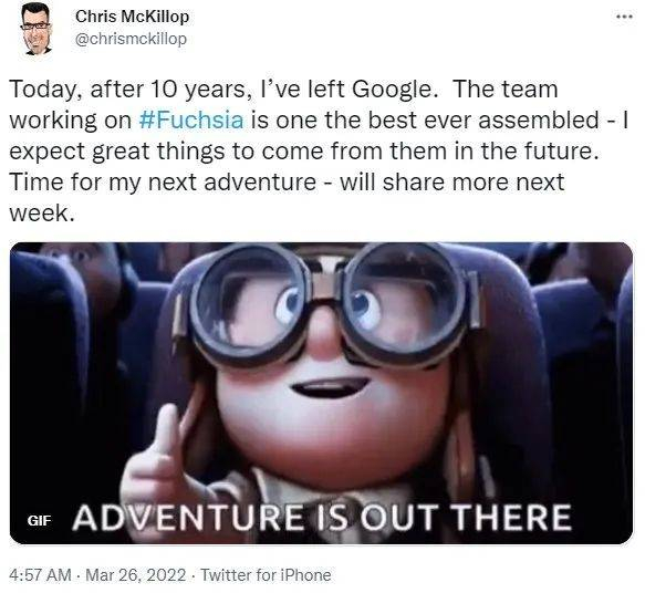 9to5Google 最近报道称,Fuchsia OS 的工程总监 Chris McKillop 已于最近离职。他之于 Fuchsia OS 的核心地位是不言而喻的,他作为项目负责人,主导了 Fuchsia OS 的开发。而作为一名十年谷歌老兵,McKillop 还协助创建了 Flutter 项目团队,并短暂参与 Android TV 电视系统的研发。