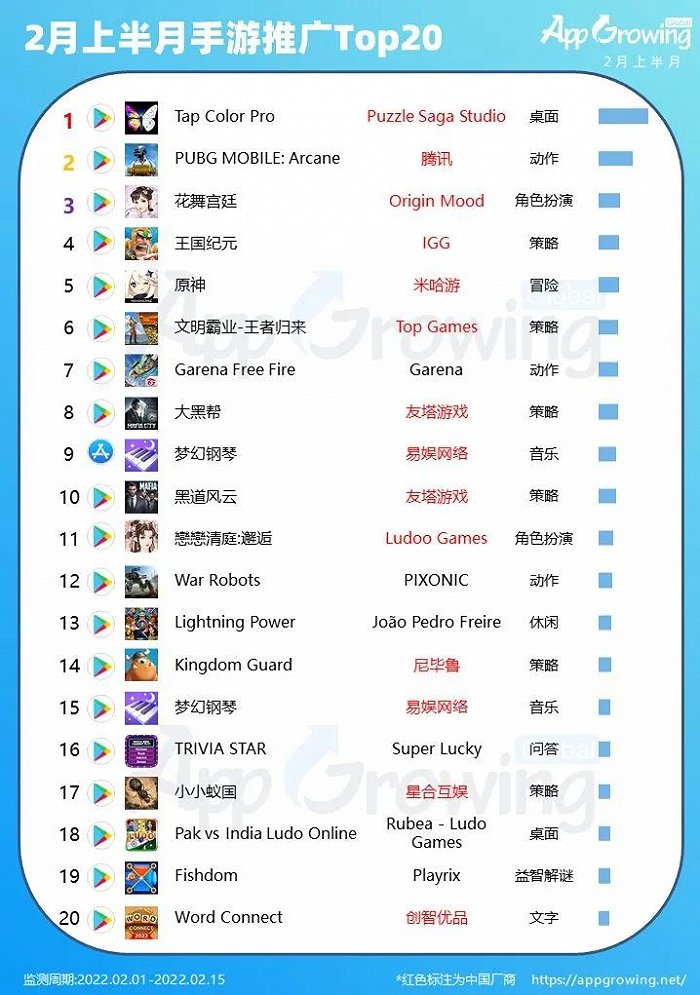 3月15日,SensorTower公布的数据显示,2022年2月中国手游出海榜中,《原神》继续霸榜第一,《PUBG MOBILE》击败莉莉丝的《万国觉醒》重回第二。