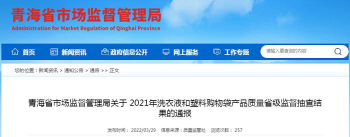青海省市场监管局通报2021年洗衣液和塑料购物袋产品质量省级监督抽查结果