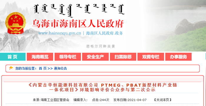 内蒙古华恒能源科技有限公司PTMEG、PBAT新型材料产业链一体化项目总投资105亿元,建设地点为内蒙古自治区乌海经济开发区低碳产业园区。