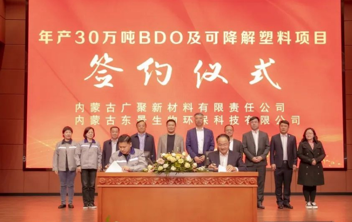 3月10日,内蒙古广聚新材料有限责任公司与内蒙古东景生物环保科技有限公司就广锦30万吨/年BDO合作项目正式签约。