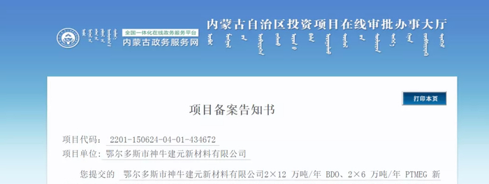 2022年1月27日,内蒙古鄂托克旗发展和改革委员会发布项目备案告知书,内蒙古三维新能源(集团)有限公司旗下子公司鄂尔多斯市神牛建元新材料有限公司2×12万吨/年 BDO、2×6万吨/年 PTMEG新材料项目符合产业政策和市场准入标准,准予备案。