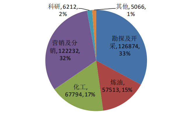 截止2021年年底,中石化主要子公司中国石化销售股份有限公司拥有员工 122232名。员工业务部门包括勘探及开采、炼油、营销及分销、化工、科研和其他,分别占比33%、15%、32%、17%、2%和1%。