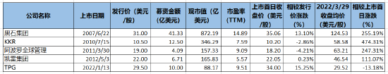 在美股上市的黑石集团、KKR、阿波罗全球管理、凯雷集团和TPG中,只有黑石集团的市盈率(TTM)达到了14.89倍,其他4家企业的市盈率(TTM)均处于5-10倍区间。