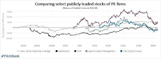 据PitchBook数据2016年的一份研究显示,在经济动荡时期,私募股权机构的股票价格会比其他公司的股票价格下降得更快、幅度更大;而在市场恢复之际,私募股权机构的股票表现又会存在一定的滞后性。