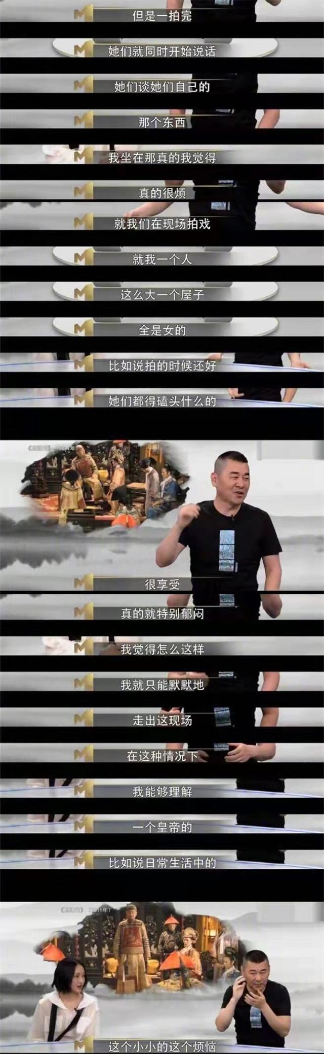 这还没完,陈建斌接着还说,“你们以为演皇帝有多美呢,戏里一群女人围着我,戏外根本没人搭理我,一个女人200只鸭子,那个屋子里就是无数只鸭子在交替说话。我烦啊。”