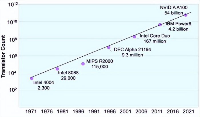 晶体管数量的增加让性能提升了多少呢?包含2300个晶体管的英特尔4004在使用10.8微秒运行周期时,可以每秒运算9万次。作为对比,包含800亿晶体管的H100最高可支持每秒4000万亿次的浮点计算。我们可以看到晶体管数量与性能明显的正相关,这也是为何所有领先的芯片公司都在晶体管数量上下足功夫。