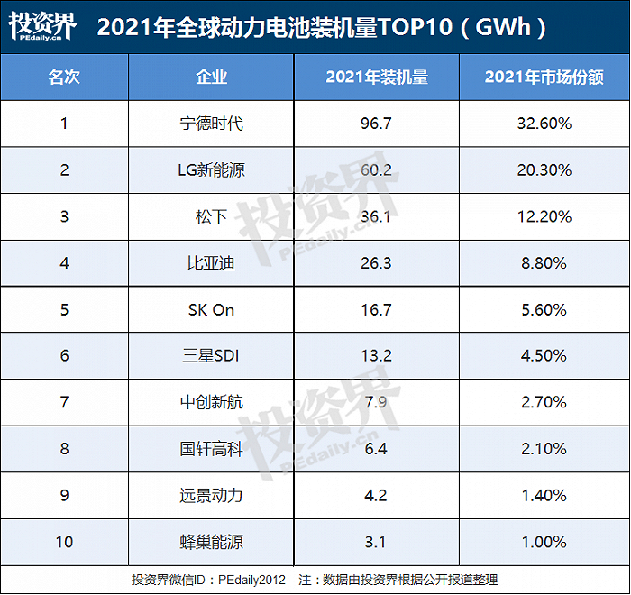 我们先来看一组排名。韩国市场研究机构SNE Research发布的最新数据显示,2021年全球动力电池装机量前十名分别为:宁德时代、LG新能源、松下、比亚迪、SK On、三星SDI、中创新航(中航锂电)、国轩高科、远景动力、蜂巢能源。