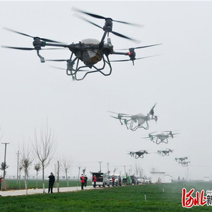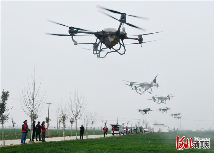 石家庄市栾城区恒丰种植专业合作社的麦田里,麦苗从地里冒出来一拃左右,十几台大型植保无人机和智能化农机正在对麦田进行水肥综合治理作业。