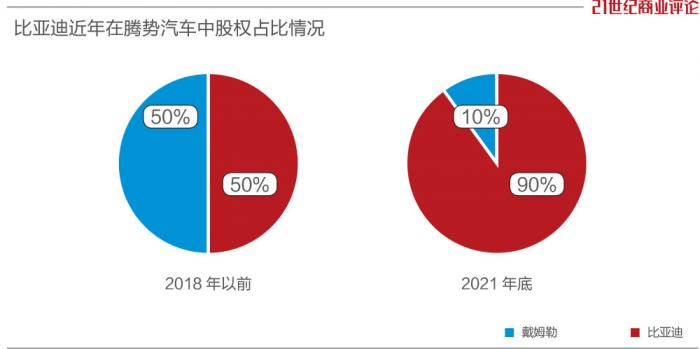 2010年,比亚迪和奔驰汽车制造商戴姆勒合资成立腾势新能源汽车,双方各自持股50%。2018年以前,比亚迪和戴姆勒持续为腾势输血,共同增资7次,股权比例不变。