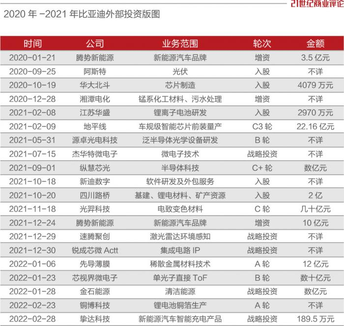 “出于战略性防御的考虑,比亚迪不会错过这些企业的投资。它在垂直领域比较强,但是不可能面面俱到。”汽车分析师郑谊向《21CBR》表示。