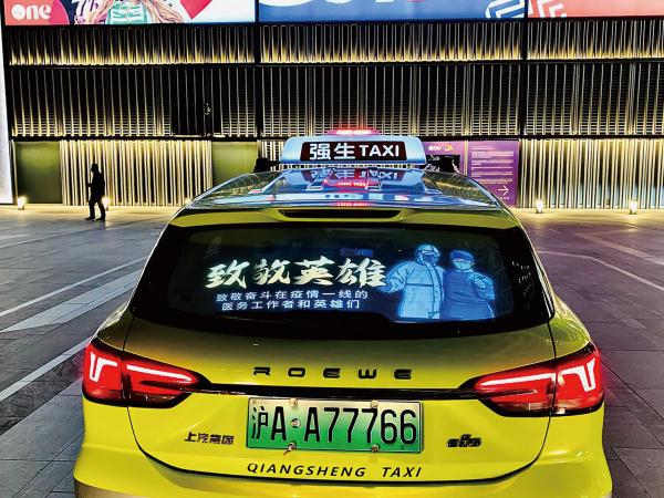 对抗疫情,“战场”不只在前方医院、社区一线,也在后方支持、保障企业。疫情期间,强生交通旗下强生广告主动担当,利用出租车后窗广告位等数字媒体资源,协同兄弟单位和社会机构共同开展志愿服务及公益宣传。为南京西路越洋广场解封设计制作了简约且有力的企业宣传车投标语,及时定点投放在现场的强生出租车群上;安排拍摄团队,用镜头记录强生出租为嘉里中心解封人员护航的感人瞬间;设计并投放政府“防疫公益”系列车投画面,帮助在全社会传递抗疫的正能量。