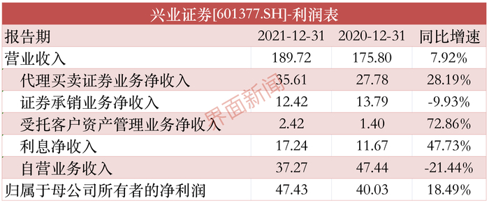 3月30日晚,兴业证券(601377.SH)披露2021年度财务数据,公司2021年实现营业收入189.72亿元,同比增长7.92%,归母净利润为47.43亿元,同比增长18.49%。