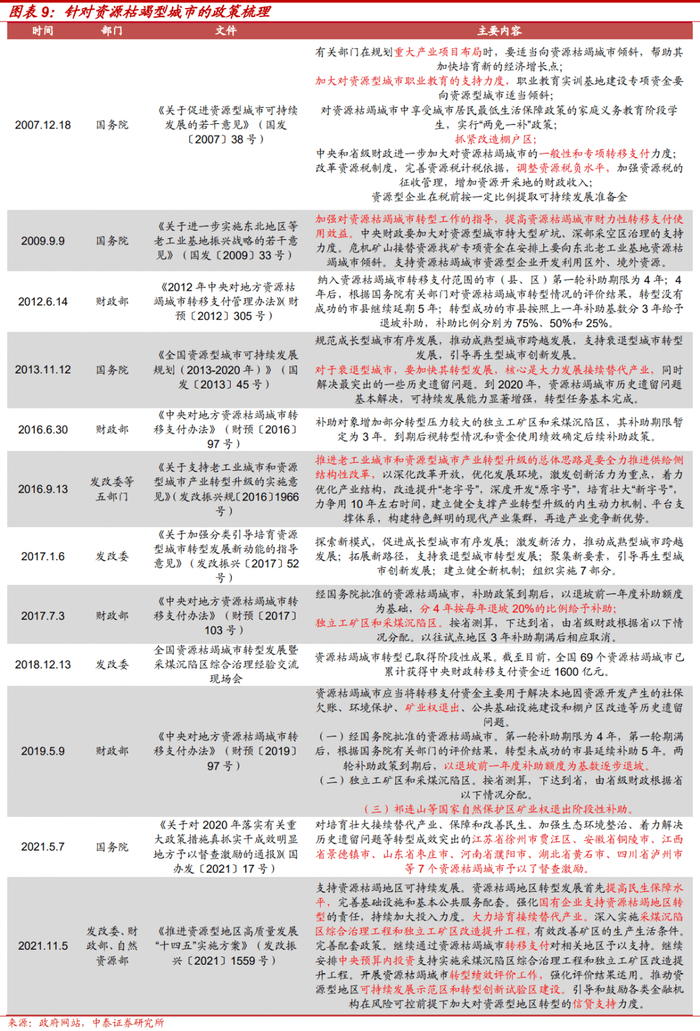 2021年,发改委等三部门联合发布《推进资源型地区高质量发展“十四五”实施方案》,资源型城市转型进入高质量发展阶段。实施方案对此前一系列政策与成果进行归纳总结,提出符合目前发展阶段的具体要求,针对资源枯竭地区,要继续培育替代产业、改善矿区生产生活条件、积极开展转型绩效评价工作,并且方案鼓励各类金融机构加大金融支持力度。总体上看,方案为“十四五”期间全面推进资源型地区高质量发展提供了方向。