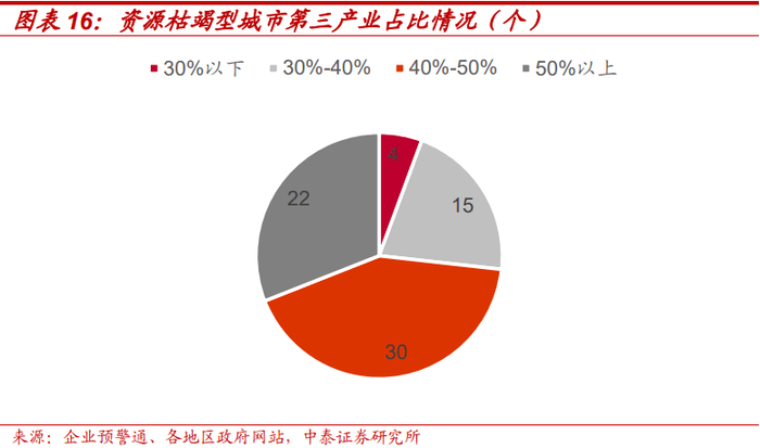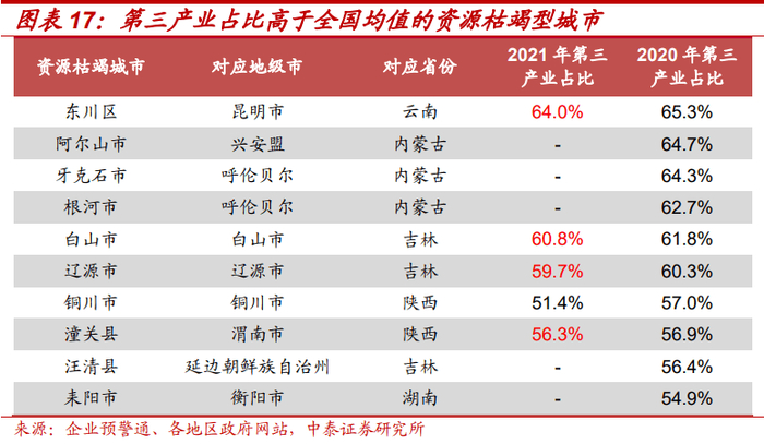 具体来看,2020年资源枯竭型城市第三产业占比大多集中在40-50%,共计30个城市位于此区间,玉门市、石拐区、逊克县、铁力市四个资源枯竭城市第三产业占比不足30%。10个资源枯竭型城市2020年第三产业占比超过全国平均水平,其中5个城市已披露2021年第三产业占比,东川区、白山市、辽源市及潼关县连续两年第三产业占比超过全国均值,这4个资源枯竭城市2021年GDP增速也高于全国平均水平。