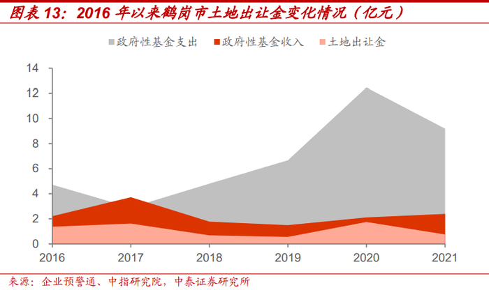 鹤岗市土地出让金收入有限,2021年规模进一步萎缩。从政府性基金收支的角度来看,鹤岗市除2017年收入大于支出,其余年份均存在入不敷出的情况,在2020年收支缺口超过10亿元。作为政府性基金收入的重要构成来源,鹤岗市土地出让金收入十分有限,常年维持在1亿元左右的水平,2021年,其规模大幅下降至0.76亿元,较去年下降了56.6%。