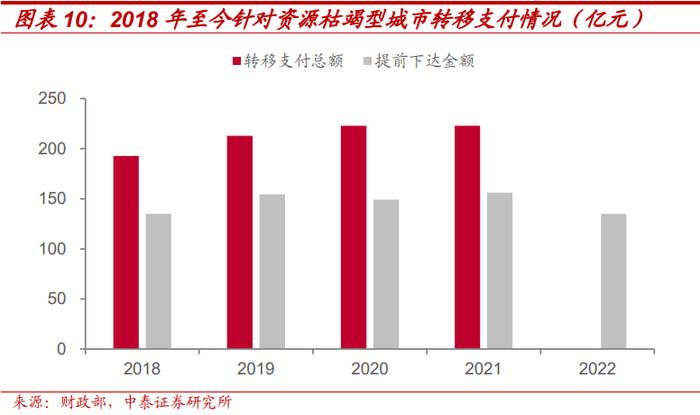 我们将2008年至今对于促进资源枯竭型城市转型发展的政策分为三个历史阶段,总结了各个阶段重点政策文件和主要内容。针对财政转移支付的重要支持举措,我们统计了2018年至今的转移支付情况,整体而言转移支付金额分布在200亿元左右。