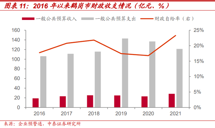 鹤岗市财政自给率偏低,财政实力较弱。2016年以来,鹤岗市一般公共预算支出维持高位的同时,一般公共预算收入规模较小,财政自给率在20%左右波动,平均值为19.7%;2021年鹤岗市一般公共预算收入28.3亿元,一般公共预算支出121.3亿元,财政自给率为23.3%。