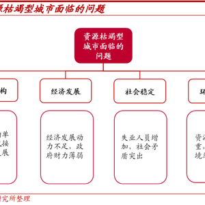 由于缺乏统筹规划、矿产等自然资源进入衰退期,资源枯竭型城市面临较大转型挑战。主要问题有:(1)产业结构单一,替代接续产业发展发力;(2)经济发展动力不足,政府财力薄弱;(3)失业人员增加,社会矛盾突出;(4)资源破坏严重,生态环境恶化。